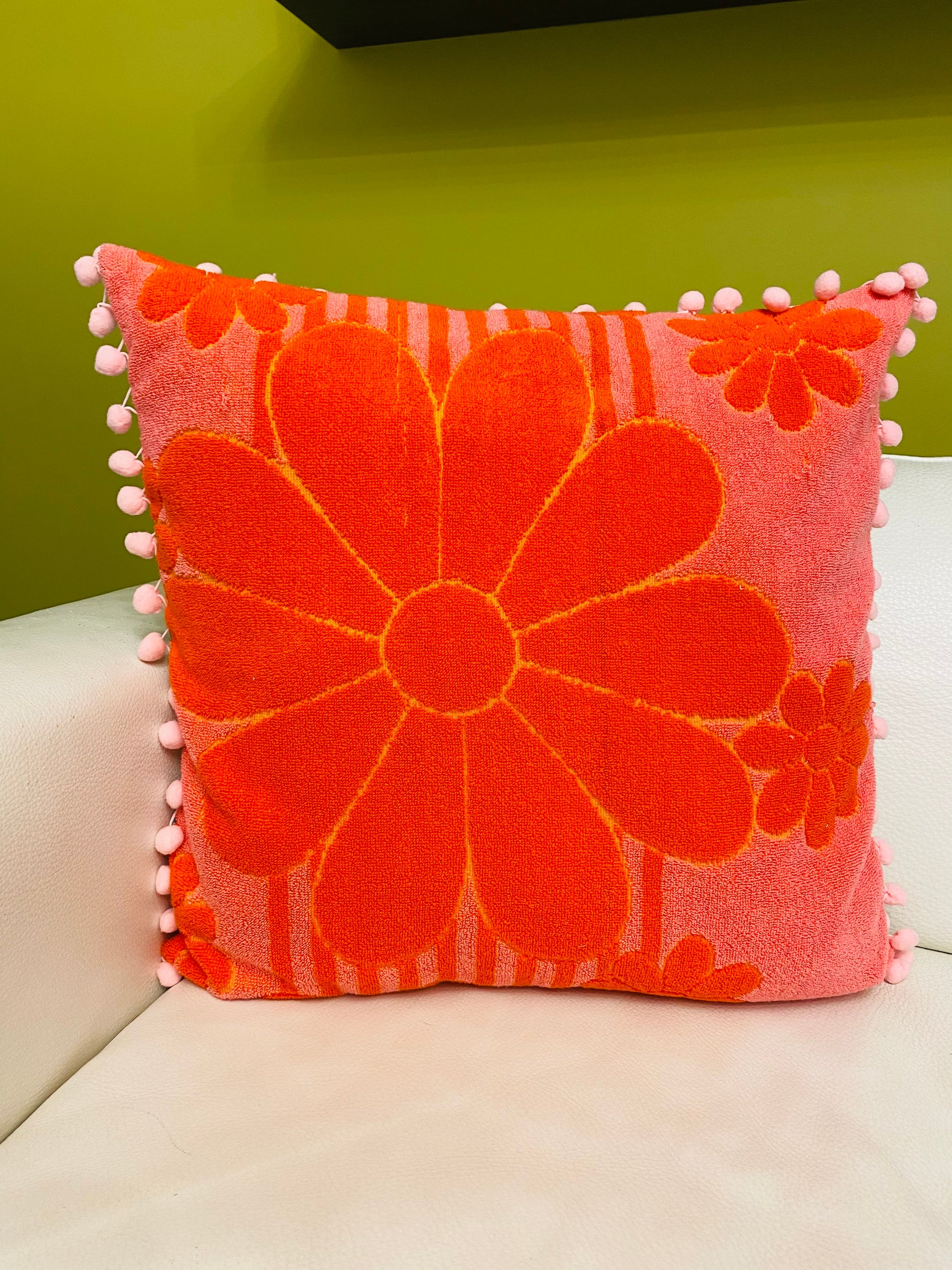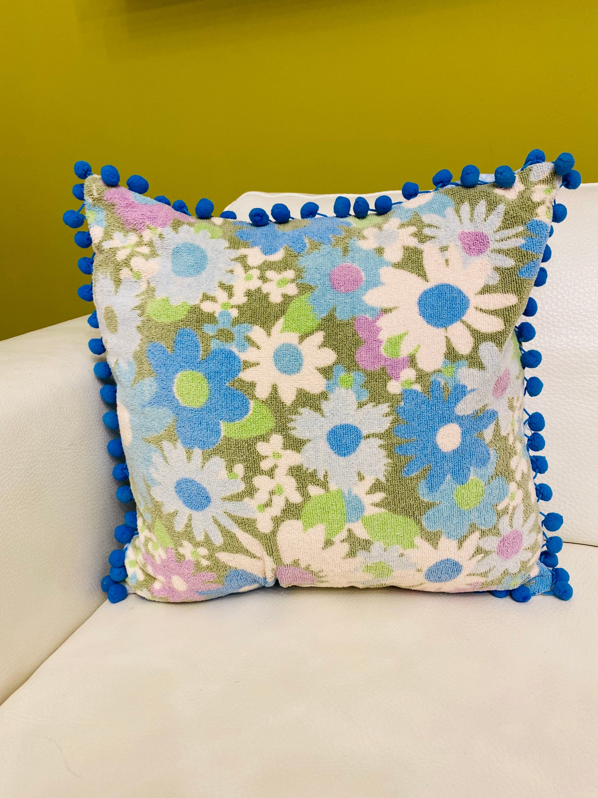 Get ready to add a touch of nostalgia to your home decor with our throw cushion cover made from vintage beach towels. With its vibrant colors and playful patterns, this cover will instantly transport you to the sunny days of the past. The pompom trim adds a fun and whimsical touch, while the Hawaiian and retro fabric backing ensures durability and style. Whether you're lounging by the pool or cozying up on the couch, this cushion cover is the perfect addition to any space.